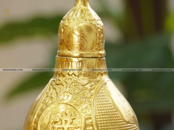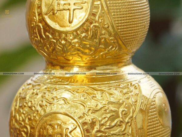 Toàn thân hồ lô được đúc từ đồng nguyên chất, dát vàng 24K bằng tay, bề mặt chạm hoa văn cổ tinh xảo cùng chữ Phúc – Lộc – Thọ và đồ hình Âm Dương Bát Quái. Sản phẩm vừa mang vẻ đẹp sang trọng, vừa là pháp khí trấn trạch chiêu tài được nhiều người lựa chọn để trưng bày trong nhà, văn phòng hay phòng thờ.