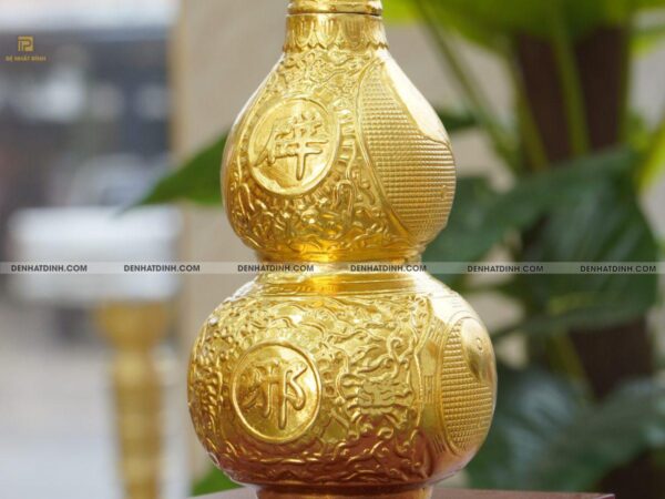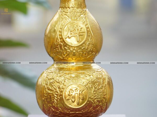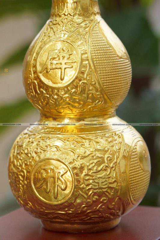 Toàn thân hồ lô được đúc từ đồng nguyên chất, dát vàng 24K bằng tay, bề mặt chạm hoa văn cổ tinh xảo cùng chữ Phúc – Lộc – Thọ và đồ hình Âm Dương Bát Quái. Sản phẩm vừa mang vẻ đẹp sang trọng, vừa là pháp khí trấn trạch chiêu tài được nhiều người lựa chọn để trưng bày trong nhà, văn phòng hay phòng thờ.