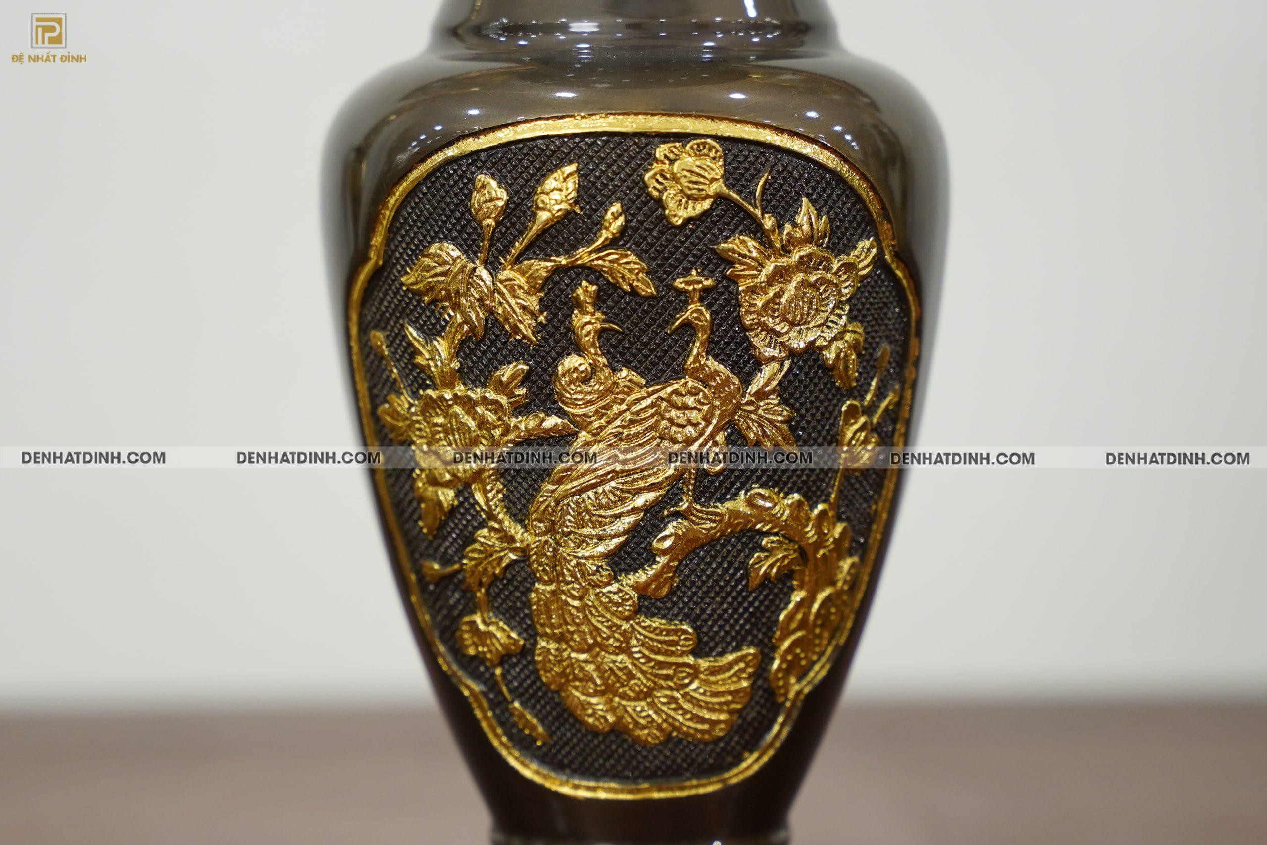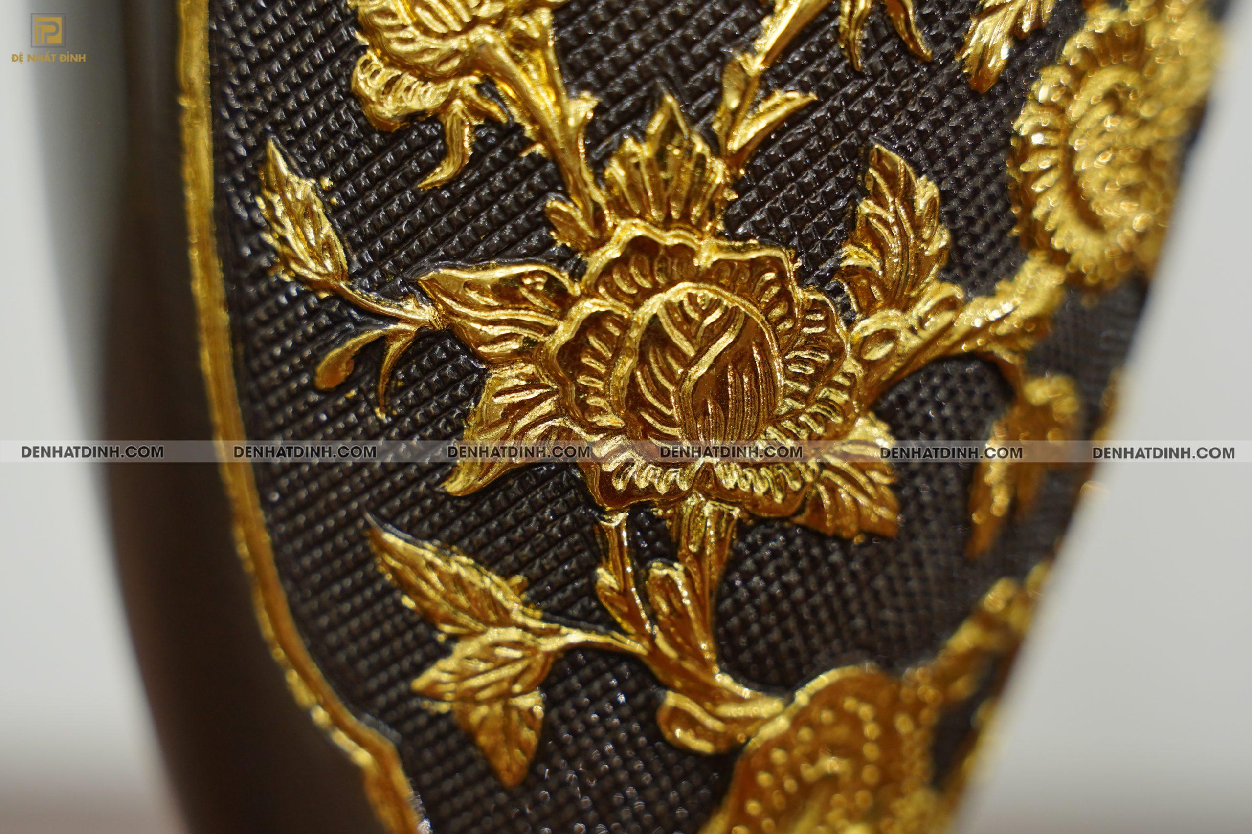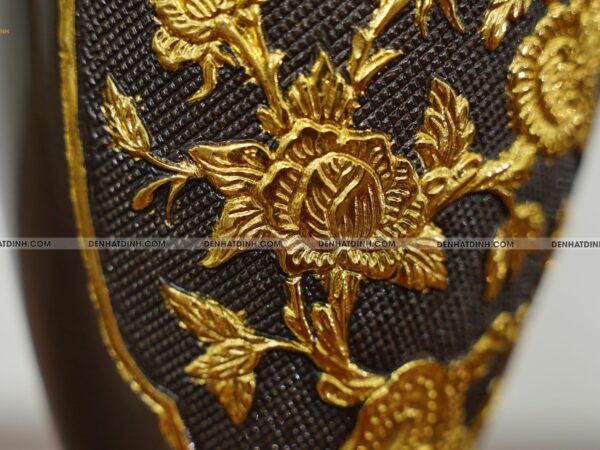 Bề mặt được dát vàng điểm cao cấp, các họa tiết hoa văn được chạm nổi tỉ mỉ, thể hiện sự tài hoa của nghệ nhân.