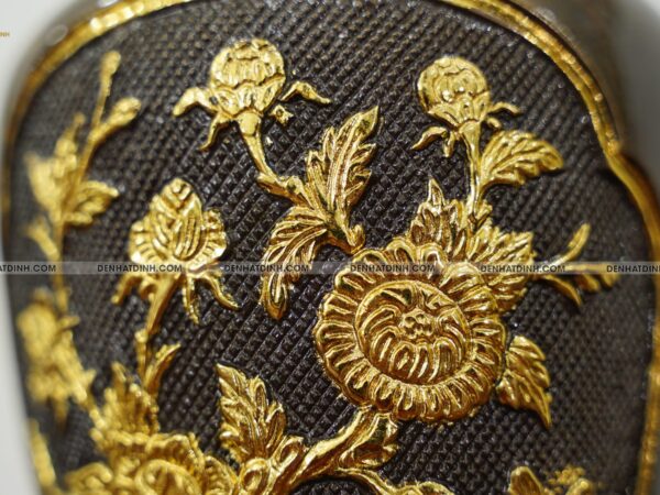Bề mặt được dát vàng điểm cao cấp, các họa tiết hoa văn được chạm nổi tỉ mỉ, thể hiện sự tài hoa của nghệ nhân.