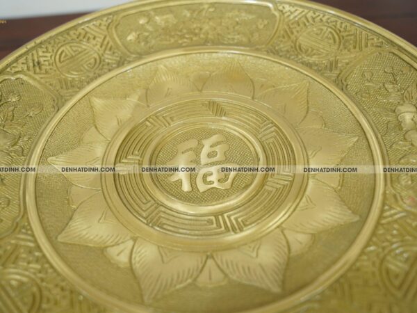 Mâm bồng hoa quả đường kính 30cm, chân đế cao 12cm, màu vàng nguyên bản là mẫu vật phẩm thờ cúng tinh xảo, được chế tác thủ công từ đồng nguyên chất. Sản phẩm mang thiết kế tròn đều, lòng mâm hơi lõm nhẹ giúp bày biện trái cây hay bánh kẹo không bị trôi trượt. Trung tâm mâm là chữ Phúc nổi được chạm tinh tế, biểu tượng cho phúc khí và niềm vui sum vầy trong gia đạo. Bao quanh chữ Phúc là họa tiết hoa sen lớn, từng cánh hoa được chạm nổi, tạo độ sâu và ánh sáng phản chiếu rất đẹp mắt. Viền ngoài của mâm được trang trí nhiều lớp hoa văn cổ điển như hình tròn cổ thư, hoa cúc, quả phúc lộc, tất cả đều được khắc họa đều tay và cân đối. Màu vàng nguyên bản của đồng không qua xử lý màu, giữ lại nét mộc mạc sang trọng, sáng bóng tự nhiên và thể hiện rõ vân kim loại. Khi ánh sáng chiếu vào, toàn bộ bề mặt mâm phản xạ nhẹ, tôn lên nét đẹp cổ điển và cao quý cho không gian thờ cúng. Chân đế cao 12cm được đúc liền với mặt mâm, đảm bảo sự chắc chắn và cân bằng khi đặt vật phẩm phía trên. Phần đế trụ được làm hình tròn, to vừa phải, giúp mâm đứng vững và tạo sự cao ráo cho tổng thể bàn thờ. Toàn bộ bề mặt sản phẩm được đánh nhẵn kỹ càng, các họa tiết vẫn giữ độ nổi tốt nhưng không sắc cạnh, an toàn khi sử dụng. Màu vàng nguyên bản mang đến sự sang trọng, tinh khiết, gần gũi với các vật phẩm đồng truyền thống trong tín ngưỡng người Việt. Kích thước đường kính 30cm là vừa đủ rộng để bày biện nhiều loại lễ vật cùng lúc mà không bị rối mắt. Chất liệu đồng đặc, dày và chắc tay, giúp sản phẩm bền bỉ theo năm tháng và không dễ cong vênh. Mâm bồng được chế tác theo phong cách cổ điển, phù hợp với mọi kiểu không gian thờ từ bàn thờ gia tiên đến bàn thờ Phật hay từ đường họ tộc. Họa tiết chữ Phúc cùng hoa sen còn góp phần thể hiện lòng tôn kính, nét thanh tịnh và sự mong cầu hạnh phúc viên mãn. Bề mặt được xử lý chống oxi hóa nhẹ, giúp sản phẩm lâu xuống màu và giữ độ sáng lâu dài. Mâm có thể dễ dàng vệ sinh bằng khăn mềm, không cần chất tẩy mạnh để bảo quản. Đây là mẫu mâm bồng tiêu biểu cho sự kết hợp giữa công năng sử dụng và giá trị nghệ thuật truyền thống, giúp không gian thờ thêm phần đầy đủ, trang trọng và linh thiêng.