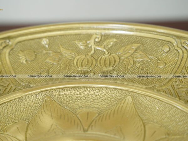 Việc sắp xếp mâm bồng trên ban thờ cần đảm bảo tính cân đối và trang nghiêm cho tổng thể không gian thờ tự. Mâm bồng thường được đặt ở vị trí trung tâm phía trước bát hương hoặc hai bên nếu sử dụng cặp mâm đối xứng. Trên mâm có thể đặt hoa quả tươi, bánh kẹo hoặc lễ vật tùy vào dịp lễ và phong tục từng vùng. Khi đặt mâm lên ban thờ, nên để mặt chữ Phúc hướng ra ngoài, vừa tạo vẻ đẹp thẩm mỹ vừa đúng phong thủy. Các loại quả được đặt nên chọn loại có ý nghĩa tốt lành như nải chuối, quả mãng cầu, táo đỏ hay phật thủ. Mâm nên được lau chùi sạch sẽ trước khi bày biện, đảm bảo tính thanh tịnh và tôn nghiêm. Nếu bàn thờ có nhiều tầng, mâm bồng nên đặt ở tầng giữa hoặc tầng dưới tùy theo thiết kế. Việc bày biện cần cân đối trái cây theo hình tròn, xếp đối xứng để tạo sự hài hòa về hình khối. Không nên đặt vật nặng hoặc sắc nhọn lên mâm vì sẽ làm hư hại bề mặt và làm mất đi ý nghĩa thanh sạch của lễ vật. Sau khi bày biện xong, nên kiểm tra mâm có bị nghiêng hay không để tránh đổ vỡ khi di chuyển hoặc lễ xong. Đối với các bàn thờ có chiều sâu nhỏ, kích thước 30cm là rất hợp lý vì không chiếm diện tích nhưng vẫn đủ chỗ cho nhiều loại lễ vật. Trong ngày rằm, mùng một hoặc dịp cúng giỗ, mâm bồng đóng vai trò chính trong việc trình bày mâm cúng và tạo không khí linh thiêng. Nếu đặt hai mâm hai bên, nên chia đều số lượng hoa quả và bố trí màu sắc tương phản nhẹ để tạo sự đối xứng đẹp mắt. Mâm bồng cũng nên được đặt cách mép bàn thờ một khoảng vừa đủ để dễ dàng quan sát và không bị vướng khi thắp nhang. Cách sắp xếp khéo léo không chỉ giúp mâm bồng phát huy giá trị thẩm mỹ mà còn thể hiện lòng tôn kính của gia chủ với tổ tiên và thần linh. Sự xuất hiện của mâm bồng vàng nguyên bản trên bàn thờ tạo nên điểm nhấn sáng sang trọng, làm nổi bật các vật phẩm khác và tôn thêm vẻ đẹp truyền thống cho không gian linh thiêng.