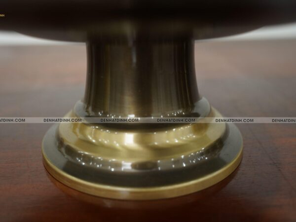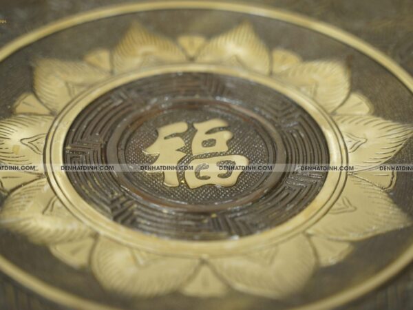 Mâm bồng hoa quả đường kính 35cm, chân đế cao 12cm, màu hun cổ là mẫu vật phẩm thờ cúng cao cấp, mang dáng tròn truyền thống kết hợp cùng họa tiết chạm tinh xảo. Toàn bộ bề mặt được chế tác từ đồng nguyên chất, xử lý bề mặt theo phương pháp hun cổ nhằm tạo sắc nâu trầm sang trọng, cổ điển và bền màu theo thời gian. Trung tâm mâm là chữ Phúc lớn khắc nổi, bao quanh bởi lớp họa tiết hoa sen mềm mại, mỗi cánh hoa đều được khắc rõ nét, tỉ mỉ và đều nhau tạo nên điểm nhấn tinh tế. Viền mâm trang trí các hoa văn tứ quý gồm mai, lan, cúc, trúc được sắp xếp cân đối, biểu trưng cho sự thanh cao, trường thọ và phú quý. Các chi tiết trang trí được làm thủ công, chạm sâu đều tay tạo hiệu ứng thị giác ấn tượng mỗi khi ánh sáng chiếu vào. Màu đồng hun cổ vừa giữ được vẻ mộc mạc nguyên sơ, vừa chống chói sáng giúp mâm trông trầm ấm và linh thiêng hơn. Phần chân đế cao 12cm được đúc liền khối, tạo sự chắc chắn tuyệt đối khi đặt vật phẩm phía trên. Chân có hình trụ lớn, đáy vững, bề mặt dưới nhẵn bóng nên không làm trầy xước mặt bàn thờ. Thiết kế lòng mâm hơi lõm xuống giúp việc sắp xếp hoa quả, bánh kẹo không bị rơi, phù hợp với mọi không gian thờ từ truyền thống đến hiện đại. Đường kính 35cm lý tưởng để bày trí đủ mâm ngũ quả, hoa tươi hay vật phẩm lễ lớn trong các dịp đặc biệt như Tết, lễ cúng giỗ hay cúng gia tiên. Đồng dày, đúc đặc không rỗng, giữ trọng lượng ổn định, tăng độ bền và độ nặng khi sử dụng. Lớp hoàn thiện bề mặt có tính chống oxi hóa nhẹ, giúp sản phẩm giữ độ đẹp lâu năm mà không bị xuống màu quá nhanh. Kiểu dáng mâm phù hợp với các bộ đồ thờ khác như đỉnh đồng, đôi hạc, chân nến tạo nên một không gian đồng bộ và trang nghiêm. Dưới ánh đèn thờ hoặc ánh nến, màu đồng hun cổ ánh lên nét cổ kính, tăng tính nghệ thuật và chiều sâu cho bàn thờ gia đình. Sản phẩm được sản xuất tại xưởng đúc uy tín, qua nhiều công đoạn kiểm tra chất lượng trước khi đến tay người dùng. Đây là một trong những mẫu mâm bồng phổ biến nhất trong không gian thờ tự hiện đại do sự cân đối giữa kích thước, màu sắc và họa tiết truyền thống. Dù sử dụng lâu năm, bề mặt vẫn giữ được độ bóng mờ thanh nhã nhờ lớp oxi hóa đều, không bị loang lổ hay bám bụi khó lau. Dễ dàng vệ sinh bằng khăn mềm ẩm, không cần đến các chất tẩy mạnh vì lớp màu cổ đã ổn định. Mâm bồng đường kính 35cm là lựa chọn lý tưởng cho gia đình có ban thờ trung hoặc lớn, phù hợp cho cả nhà phố, biệt thự hoặc không gian thờ cúng tâm linh tại từ đường.
