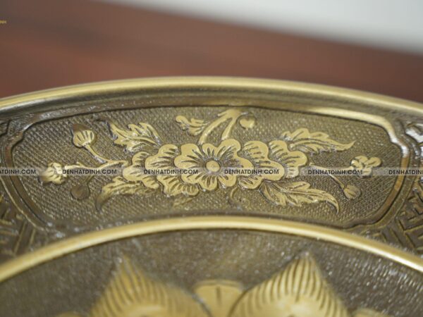 Mâm bồng hoa quả đường kính 35cm, chân đế cao 12cm, màu hun cổ là mẫu vật phẩm thờ cúng cao cấp, mang dáng tròn truyền thống kết hợp cùng họa tiết chạm tinh xảo. Toàn bộ bề mặt được chế tác từ đồng nguyên chất, xử lý bề mặt theo phương pháp hun cổ nhằm tạo sắc nâu trầm sang trọng, cổ điển và bền màu theo thời gian. Trung tâm mâm là chữ Phúc lớn khắc nổi, bao quanh bởi lớp họa tiết hoa sen mềm mại, mỗi cánh hoa đều được khắc rõ nét, tỉ mỉ và đều nhau tạo nên điểm nhấn tinh tế. Viền mâm trang trí các hoa văn tứ quý gồm mai, lan, cúc, trúc được sắp xếp cân đối, biểu trưng cho sự thanh cao, trường thọ và phú quý. Các chi tiết trang trí được làm thủ công, chạm sâu đều tay tạo hiệu ứng thị giác ấn tượng mỗi khi ánh sáng chiếu vào. Màu đồng hun cổ vừa giữ được vẻ mộc mạc nguyên sơ, vừa chống chói sáng giúp mâm trông trầm ấm và linh thiêng hơn. Phần chân đế cao 12cm được đúc liền khối, tạo sự chắc chắn tuyệt đối khi đặt vật phẩm phía trên. Chân có hình trụ lớn, đáy vững, bề mặt dưới nhẵn bóng nên không làm trầy xước mặt bàn thờ. Thiết kế lòng mâm hơi lõm xuống giúp việc sắp xếp hoa quả, bánh kẹo không bị rơi, phù hợp với mọi không gian thờ từ truyền thống đến hiện đại. Đường kính 35cm lý tưởng để bày trí đủ mâm ngũ quả, hoa tươi hay vật phẩm lễ lớn trong các dịp đặc biệt như Tết, lễ cúng giỗ hay cúng gia tiên. Đồng dày, đúc đặc không rỗng, giữ trọng lượng ổn định, tăng độ bền và độ nặng khi sử dụng. Lớp hoàn thiện bề mặt có tính chống oxi hóa nhẹ, giúp sản phẩm giữ độ đẹp lâu năm mà không bị xuống màu quá nhanh. Kiểu dáng mâm phù hợp với các bộ đồ thờ khác như đỉnh đồng, đôi hạc, chân nến tạo nên một không gian đồng bộ và trang nghiêm. Dưới ánh đèn thờ hoặc ánh nến, màu đồng hun cổ ánh lên nét cổ kính, tăng tính nghệ thuật và chiều sâu cho bàn thờ gia đình. Sản phẩm được sản xuất tại xưởng đúc uy tín, qua nhiều công đoạn kiểm tra chất lượng trước khi đến tay người dùng. Đây là một trong những mẫu mâm bồng phổ biến nhất trong không gian thờ tự hiện đại do sự cân đối giữa kích thước, màu sắc và họa tiết truyền thống. Dù sử dụng lâu năm, bề mặt vẫn giữ được độ bóng mờ thanh nhã nhờ lớp oxi hóa đều, không bị loang lổ hay bám bụi khó lau. Dễ dàng vệ sinh bằng khăn mềm ẩm, không cần đến các chất tẩy mạnh vì lớp màu cổ đã ổn định. Mâm bồng đường kính 35cm là lựa chọn lý tưởng cho gia đình có ban thờ trung hoặc lớn, phù hợp cho cả nhà phố, biệt thự hoặc không gian thờ cúng tâm linh tại từ đường.