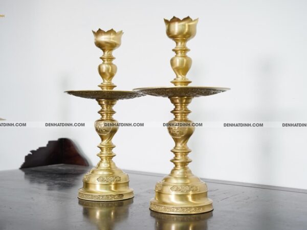 Đôi nến đèn kỹ mộc có tông màu vàng mộc tự nhiên của đồng cattut, ánh sắc trầm ổn, mang vẻ đẹp cổ điển và trang nghiêm. Bề mặt giữ được độ bóng nhẹ, không sơn phủ công nghiệp, tạo cảm giác gần gũi, chân thực và sang trọng.