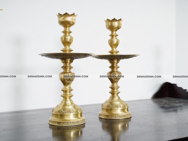 Đôi nến đèn kỹ mộc có tông màu vàng mộc tự nhiên của đồng cattut, ánh sắc trầm ổn, mang vẻ đẹp cổ điển và trang nghiêm. Bề mặt giữ được độ bóng nhẹ, không sơn phủ công nghiệp, tạo cảm giác gần gũi, chân thực và sang trọng.