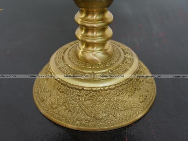 Với chiều cao lên tới 52cm, nến đồng chữ Phúc 52 sở hữu hình dáng bề thế, đường nét mạnh mẽ nhưng không kém phần thanh thoát. Phần đế được làm rộng bản, chạm khắc họa tiết sen cách điệu hoặc vân mây cổ, mang đậm nét truyền thống của mỹ nghệ đồng Việt Nam. Phần thân nến được chia thành nhiều tầng khối tròn uốn lượn, tạo cảm giác mềm mại và tinh tế, đồng thời tăng sự vững chắc khi bài trí trên bàn thờ.