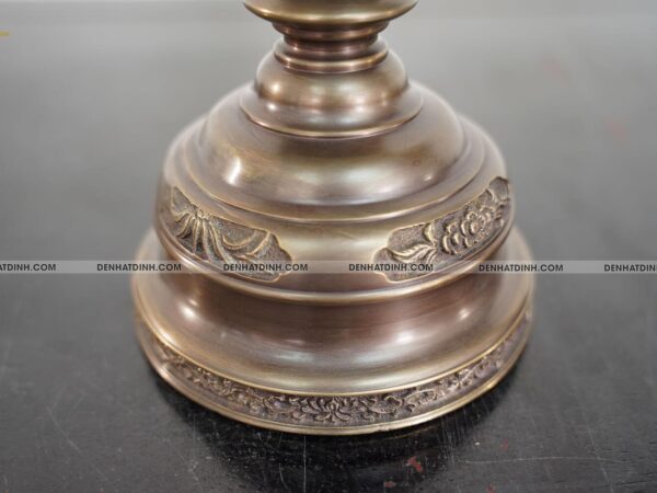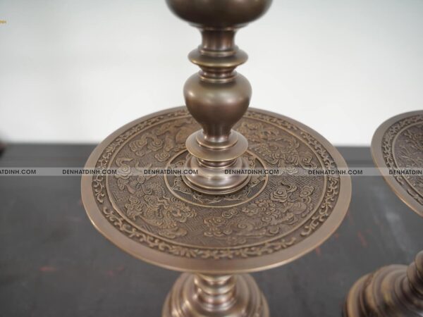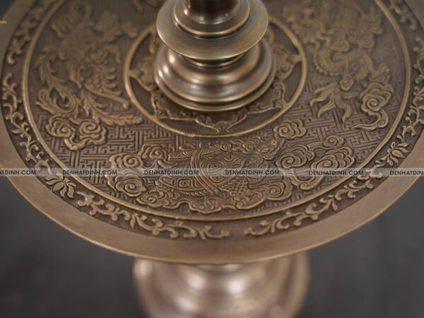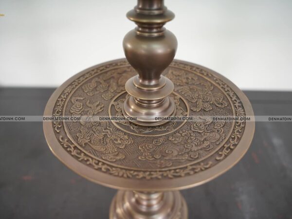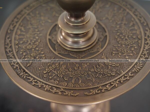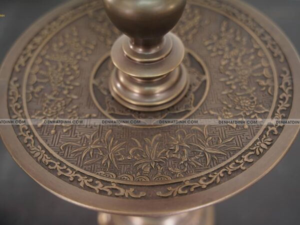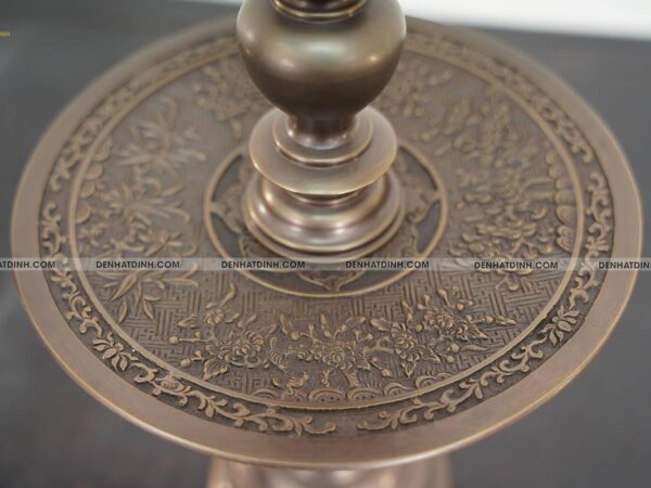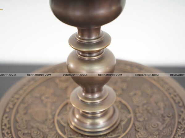 Nến đèn kỹ màu hun nâu là sản phẩm thờ cúng tinh xảo, được chế tác từ đồng nguyên khối với kỹ thuật đúc liền thân hiện đại. Phần thân đèn có dáng đứng chắc chắn, bệ đèn rộng tạo độ cân bằng tốt khi đặt trên bàn thờ. Toàn bộ thân nến được thiết kế liền khối, không hàn nối, đảm bảo độ bền và tính thẩm mỹ cao. Đĩa nến rộng, được chạm khắc hoa văn tỉ mỉ, mang tính nghệ thuật và phong thủy sâu sắc. Hoa văn trên đĩa gồm hai mặt đối xứng, thể hiện bốn linh vật Long, Lân, Quy, Phụng và bốn loài hoa biểu tượng Tùng, Cúc, Trúc, Mai. Những hoa văn này được khắc sắc nét bằng phương pháp thủ công truyền thống, giữ trọn tinh thần văn hóa Việt. Phần cốc nến được tạo hình hoa sen nở, có thể đựng được nến cốc hoặc nến cây linh hoạt, phù hợp với nhiều nghi lễ khác nhau. Màu hun nâu cổ điển tạo nên vẻ trang trọng, thanh tịnh và tôn nghiêm cho không gian thờ tự. Bề mặt nến được xử lý nhám nhẹ, không bóng loáng, tạo cảm giác cổ kính và vững chãi. Đường nét uốn lượn mềm mại ở thân và đế nến thể hiện sự tỉ mỉ và tâm huyết của người thợ. Với chiều cao tiêu chuẩn 48cm, sản phẩm phù hợp với nhiều loại bàn thờ từ bàn thờ gia tiên đến bàn thờ Phật.