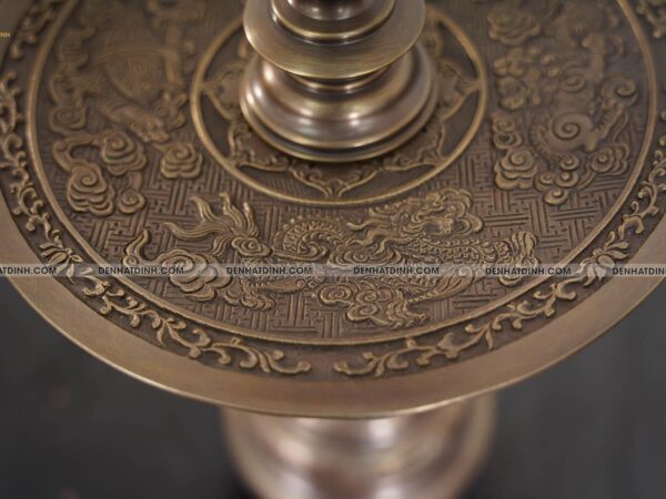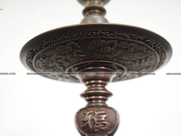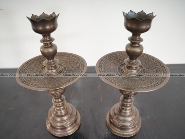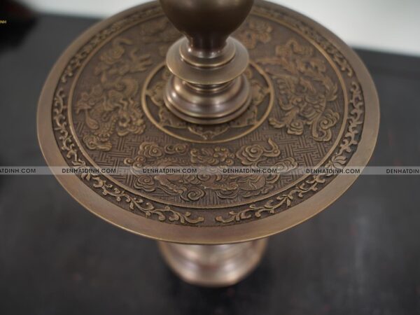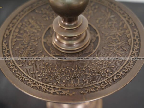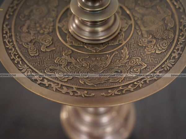 Nến đèn kỹ màu hun nâu là sản phẩm thờ cúng tinh xảo, được chế tác từ đồng nguyên khối với kỹ thuật đúc liền thân hiện đại. Phần thân đèn có dáng đứng chắc chắn, bệ đèn rộng tạo độ cân bằng tốt khi đặt trên bàn thờ. Toàn bộ thân nến được thiết kế liền khối, không hàn nối, đảm bảo độ bền và tính thẩm mỹ cao. Đĩa nến rộng, được chạm khắc hoa văn tỉ mỉ, mang tính nghệ thuật và phong thủy sâu sắc. Hoa văn trên đĩa gồm hai mặt đối xứng, thể hiện bốn linh vật Long, Lân, Quy, Phụng và bốn loài hoa biểu tượng Tùng, Cúc, Trúc, Mai. Những hoa văn này được khắc sắc nét bằng phương pháp thủ công truyền thống, giữ trọn tinh thần văn hóa Việt. Phần cốc nến được tạo hình hoa sen nở, có thể đựng được nến cốc hoặc nến cây linh hoạt, phù hợp với nhiều nghi lễ khác nhau. Màu hun nâu cổ điển tạo nên vẻ trang trọng, thanh tịnh và tôn nghiêm cho không gian thờ tự. Bề mặt nến được xử lý nhám nhẹ, không bóng loáng, tạo cảm giác cổ kính và vững chãi. Đường nét uốn lượn mềm mại ở thân và đế nến thể hiện sự tỉ mỉ và tâm huyết của người thợ. Với chiều cao tiêu chuẩn 48cm, sản phẩm phù hợp với nhiều loại bàn thờ từ bàn thờ gia tiên đến bàn thờ Phật.