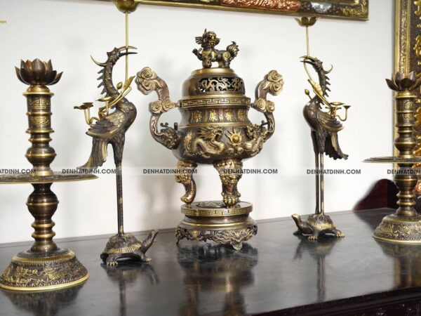 Nếu bạn đang tìm kiếm một bộ ngũ sự hoàn hảo để trang trí và thờ cúng, bộ ngũ sự song long 65 mẫu 3 hoa văn CN 36kg là lựa chọn tuyệt vời. Hãy liên hệ với chúng tôi ngay hôm nay để được tư vấn và đặt hàng.