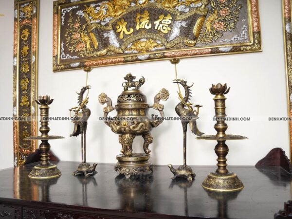 Bộ ngũ sự với hoa văn tinh xảo và màu sắc đặc trưng không chỉ làm tăng thêm vẻ đẹp cho không gian thờ cúng mà còn mang lại cảm giác trang nghiêm và thanh tịnh.