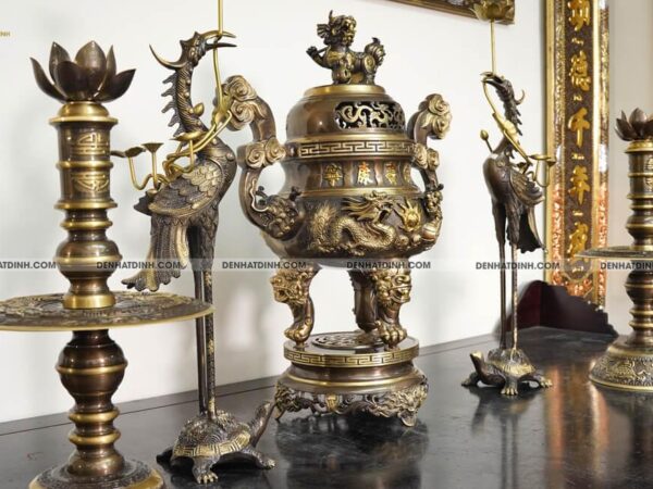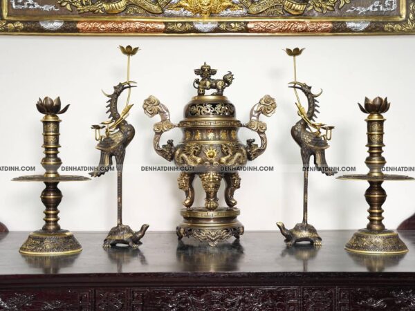 Bộ ngũ sự với hoa văn tinh xảo và màu sắc đặc trưng không chỉ làm tăng thêm vẻ đẹp cho không gian thờ cúng mà còn mang lại cảm giác trang nghiêm và thanh tịnh.