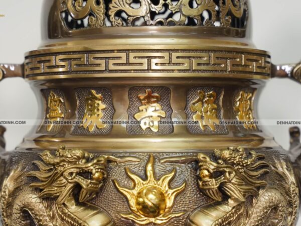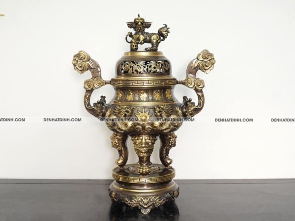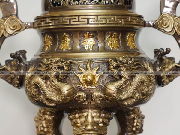Mặt trước thân đỉnh được đúc hoa văn Rồng Chầu Nguyệt, mặt sau thân đỉnh được đúc hoa văn Phượng Cuốn Thư và chân đỉnh đồng được gia công đúc liền nguyên khối với bụng đỉnh tạo sự vững chãi cho sản phẩm.