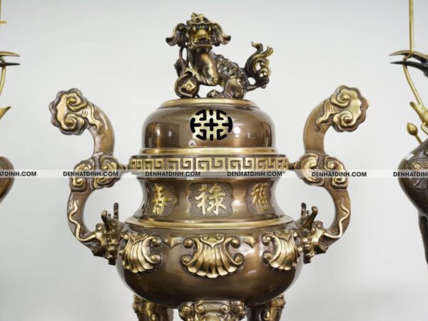 - Mô tả tổng quan: Bộ tam sự này bao gồm 3 vật phẩm chính: đỉnh đồng, đôi hạc và đôi chân nến. Các họa tiết trên bộ sản phẩm, đặc biệt là hoa sòi, được chạm khắc tỉ mỉ và tinh xảo, tạo nên vẻ đẹp thiêng liêng và tôn kính.