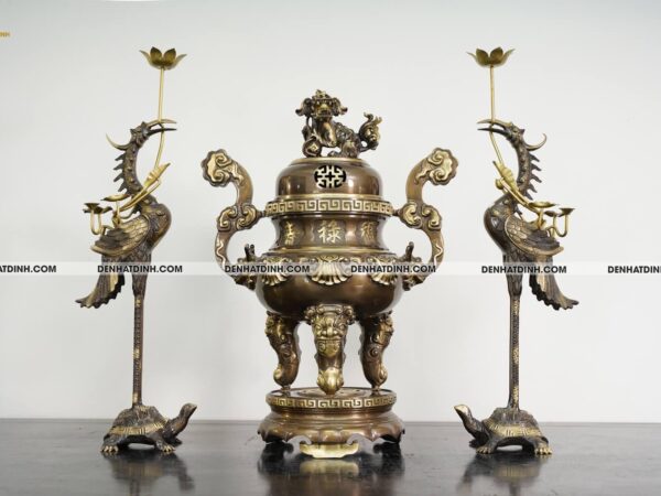Tam sự hạc hoa sòi 65 CN là một bộ trang trí thờ cúng cao cấp, bao gồm đỉnh đồng, đôi hạc và các họa tiết tinh xảo. Dưới đây là những điểm đặc biệt làm cho bộ sản phẩm này đứng out so với các sản phẩm khác: