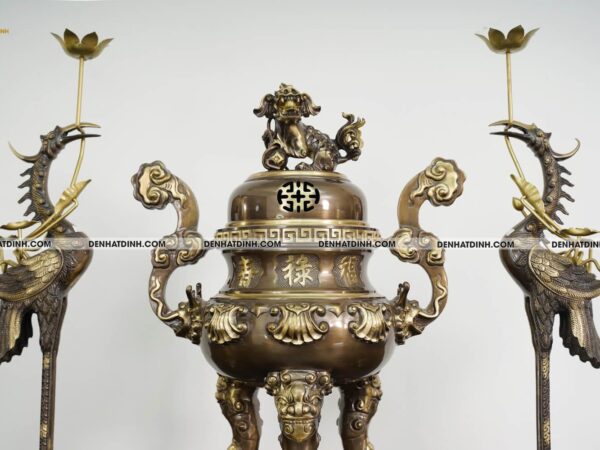 - Ý nghĩa phong thủy: Bộ tam sự hoa sòi không chỉ là vật phẩm thờ cúng mà còn mang ý nghĩa phong thủy sâu sắc. Đỉnh đồng đại diện cho sự kết nối tâm linh, đôi hạc mang ý nghĩa trường tồn và thanh cao, đôi chân nến tượng trưng cho sự soi sáng và dẫn đường.