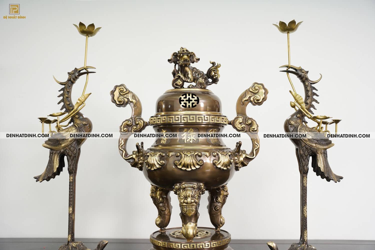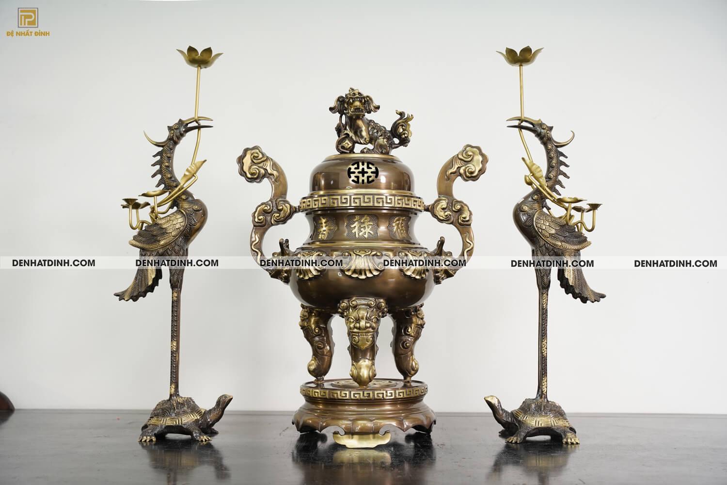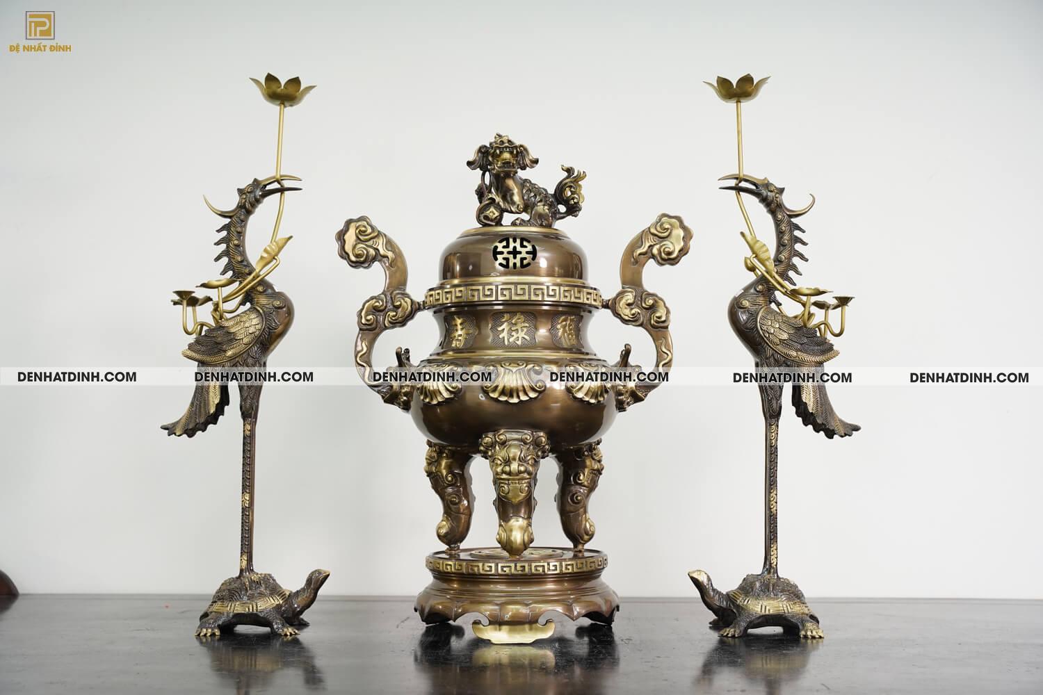 - Đỉnh đồng cao 65cm, đôi hạc cao 65cm, tạo sự cân đối và hài hòa cho bàn thờ. Kích thước này giúp bộ sản phẩm trở thành điểm trung tâm nổi bật trong không gian thờ cúng.
