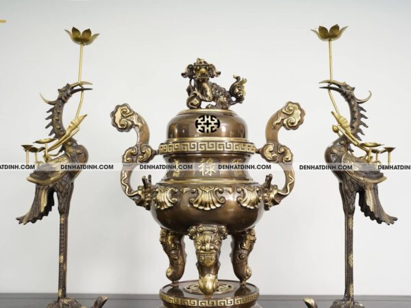 Tam sự hạc hoa sòi 65 CN là một bộ trang trí thờ cúng cao cấp, bao gồm đỉnh đồng, đôi hạc và các họa tiết tinh xảo. Dưới đây là những điểm đặc biệt làm cho bộ sản phẩm này đứng out so với các sản phẩm khác: