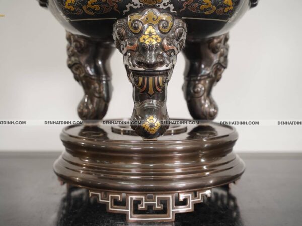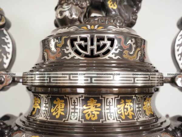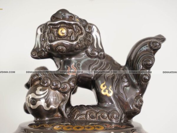 Nắp đỉnh được tạo hình nghê chầu đầy oai phong, mang ý nghĩa bảo vệ và trấn giữ phong thủy và chân đỉnh được khảm ngũ sắc, tạo sự vững chãi và thẩm mỹ cao.