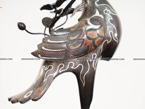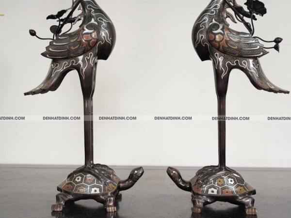 Hạc đứng trên mai rùa, biểu tượng của sự trường thọ và hòa hợp âm dương. Đôi hạc thường được đặt hai bên đỉnh đồng, tạo thế cân đối.