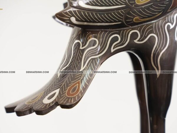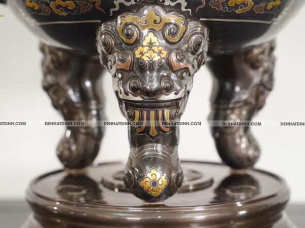 Nắp đỉnh được tạo hình nghê chầu đầy oai phong, mang ý nghĩa bảo vệ và trấn giữ phong thủy và chân đỉnh được khảm ngũ sắc, tạo sự vững chãi và thẩm mỹ cao.