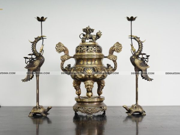 - Đặt đỉnh đồng: Đặt đỉnh đồng vào vị trí trung tâm, sau đó đặt đôi hạc thờ hai bên. Đảm bảo rằng đôi hạc được đặt đối xứng và cân bằng.