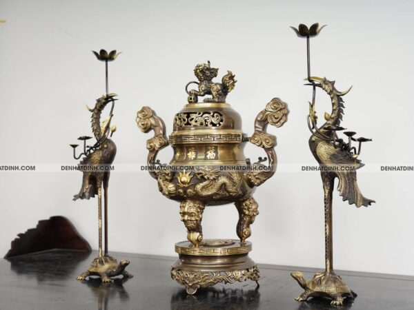 Với kích thước này, sản phẩm phù hợp với bàn thờ có chiều dài từ 1m55 – 1m76, tạo nên một không gian thờ cúng hài hòa và sang trọng. Ngoài ra, nếu bàn thờ nhà bạn có chiều dài hơn 1m76 thì có thể lựa chọn bộ ngũ sự bằng đồng với đầy đủ 5 món gồm đỉnh đồng, 2 chân nến và 2 hạc đứng.