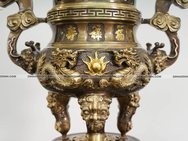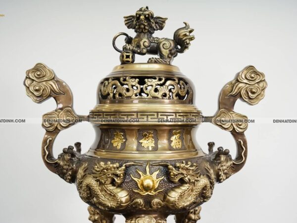 - Hoa văn: Điểm nhấn của bộ tam sự chính là họa tiết song long chầu mặt nguyệt được chạm khắc tỉ mỉ, thể hiện sự uy nghiêm, quyền lực và mang ý nghĩa phong thủy sâu sắc, tượng trưng cho sự bảo hộ và vượng khí.