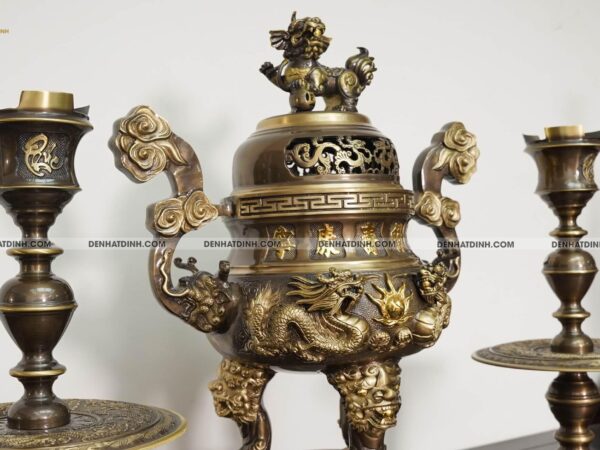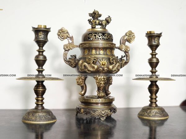 Thông số kỹ thuật Bộ tam sự Song Long bằng đồng cattut đỉnh cao 66, 5 chữ và đôi chân nến chữ Phúc