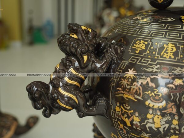 Chính diện trên thân của đỉnh đồng thất lân đồng đỏ 1m2 khảm tam khí được chạm tranh Vinh Quy Bái Tổ hình ảnh Trạng Nguyên cưỡi ngựa cùng đoàn tùy tùng theo sau mang ý nghĩa “uống nước nhớ nguồn” bao đời của người Việt Nam. Ngoài họa tiết của 3 chú kỳ lân thì còn được gợn sóng các họa tiết mỹ nghệ công phu theo phong cách cổ xưa, mang sức mạnh kỳ bí. Phúc – Lộc – Thọ – Khang – Ninh là 5 chữ hán quen thuộc thường được sử dụng trong những sản phẩm đỉnh thất lân đồng đỏ 90 vờn cầu được dát vàng tinh xảo.