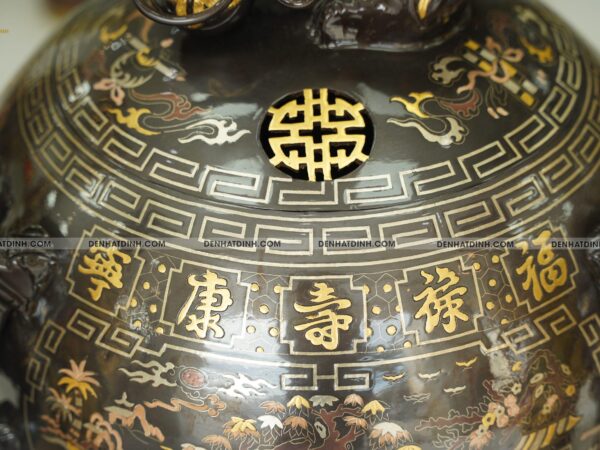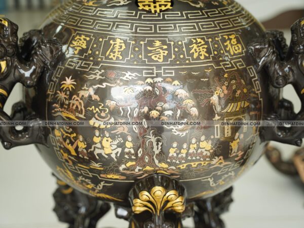 Chính diện trên thân của đỉnh đồng thất lân đồng đỏ 1m2 khảm tam khí được chạm tranh Vinh Quy Bái Tổ hình ảnh Trạng Nguyên cưỡi ngựa cùng đoàn tùy tùng theo sau mang ý nghĩa “uống nước nhớ nguồn” bao đời của người Việt Nam. Ngoài họa tiết của 3 chú kỳ lân thì còn được gợn sóng các họa tiết mỹ nghệ công phu theo phong cách cổ xưa, mang sức mạnh kỳ bí. Phúc – Lộc – Thọ – Khang – Ninh là 5 chữ hán quen thuộc thường được sử dụng trong những sản phẩm đỉnh thất lân đồng đỏ 90 vờn cầu được dát vàng tinh xảo.