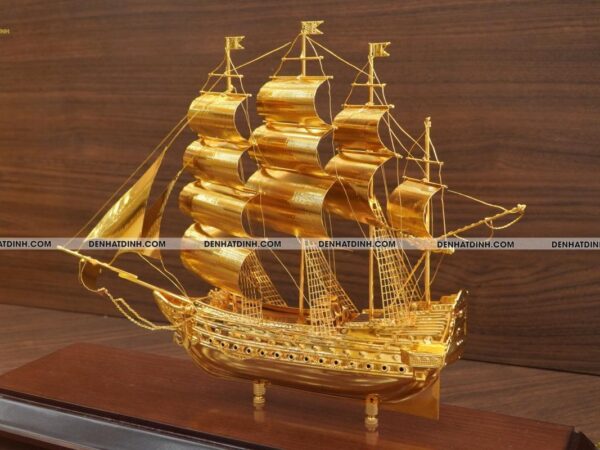 Thuyền buồm được làm từ đồng nguyên chất, sau đó trải qua quá trình mạ vàng tinh tế để tạo độ sáng bóng, chống oxy hóa và bền màu theo thời gian. Từng chi tiết nhỏ trên thân thuyền, cánh buồm, mũi thuyền hay dây neo đều được gia công tỉ mỉ, mang lại vẻ đẹp sống động, chân thực. Các cánh buồm được tạo hình uốn lượn mềm mại, mô phỏng hình ảnh thuyền căng buồm lướt gió trên biển khơi.