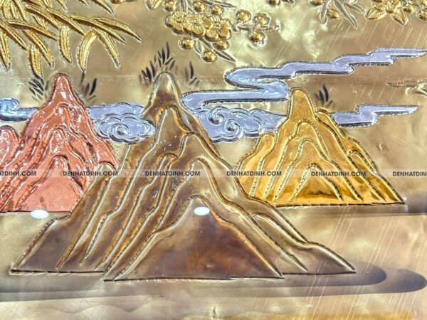 Chất liệu đồng vàng cao cấp, dát vàng sáng bóng, giúp tranh bền màu theo thời gian.
