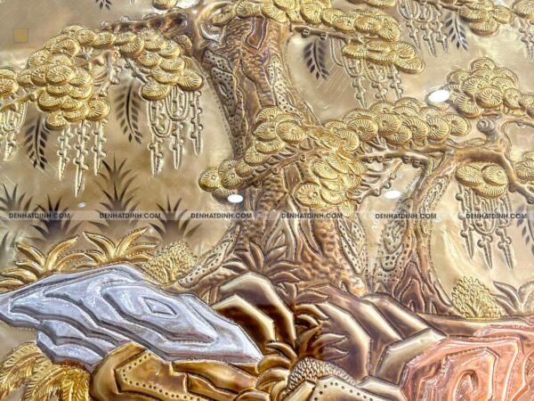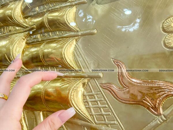 Chất liệu đồng vàng cao cấp, dát vàng sáng bóng, giúp tranh bền màu theo thời gian.