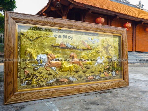 Bề mặt tranh được dát vàng, điểm bạc tạo hiệu ứng ánh kim lấp lánh, sang trọng và thu hút ánh nhìn. Hình ảnh ngựa được khắc họa sống động, khỏe khoắn, từng đường cơ bắp, bờm và vó ngựa thể hiện thần thái dũng mãnh, tốc độ và quyết tâm.