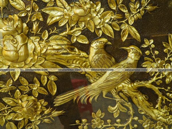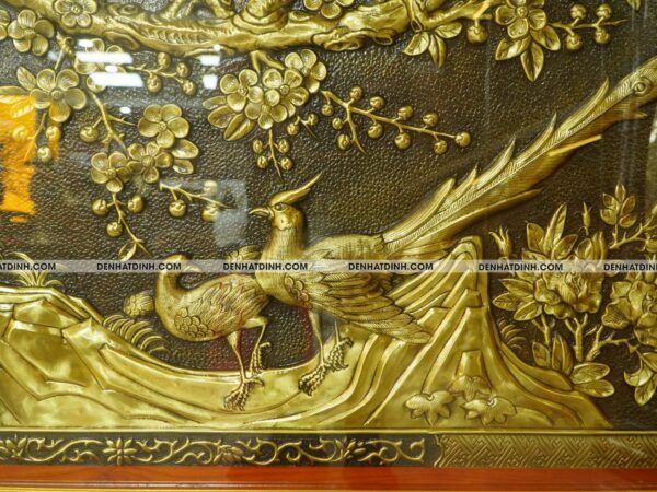 Điểm đặc biệt làm nên giá trị vượt trội của bức tranh này chính là chất liệu đồng nguyên tấm cao cấp, được tuyển chọn kỹ càng để đảm bảo độ dày dặn, chắc chắn, không pha tạp. Từ tấm đồng nguyên bản, các nghệ nhân tại ĐỆ NHẤT ĐỈNH – đơn vị uy tín hàng đầu trong lĩnh vực chế tác tranh đồng – đã thúc nổi hoa văn hoàn toàn bằng tay, từng nét chạm trổ đều thể hiện sự tài hoa, tỉ mỉ và cái tâm với nghề.