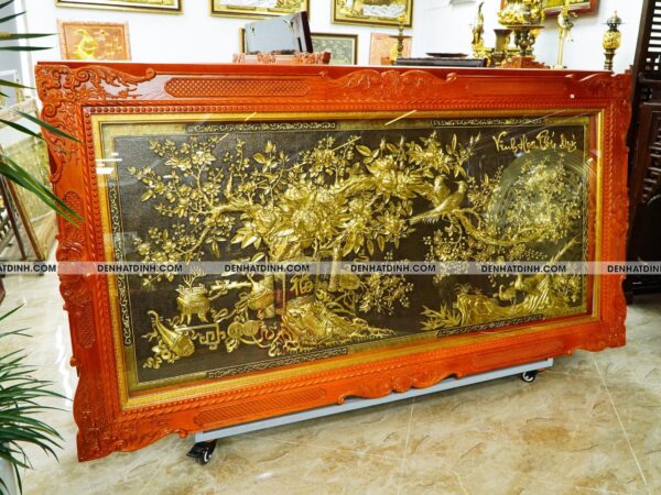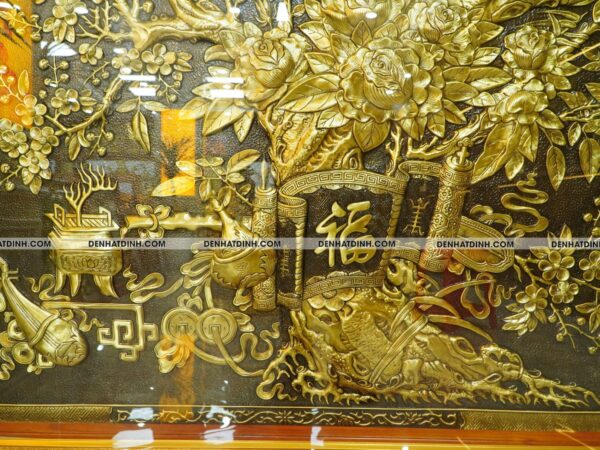 Bức tranh được phủ lớp màu giả cổ cao cấp, giúp nổi bật đường nét hoa văn vàng óng ánh, đồng thời tạo chiều sâu thị giác, tăng tính thẩm mỹ. Màu sắc này không chỉ tôn lên vẻ cổ kính, trang nhã mà còn giúp tranh giữ được độ mới lâu dài, không bị phai màu, oxy hóa theo thời gian.