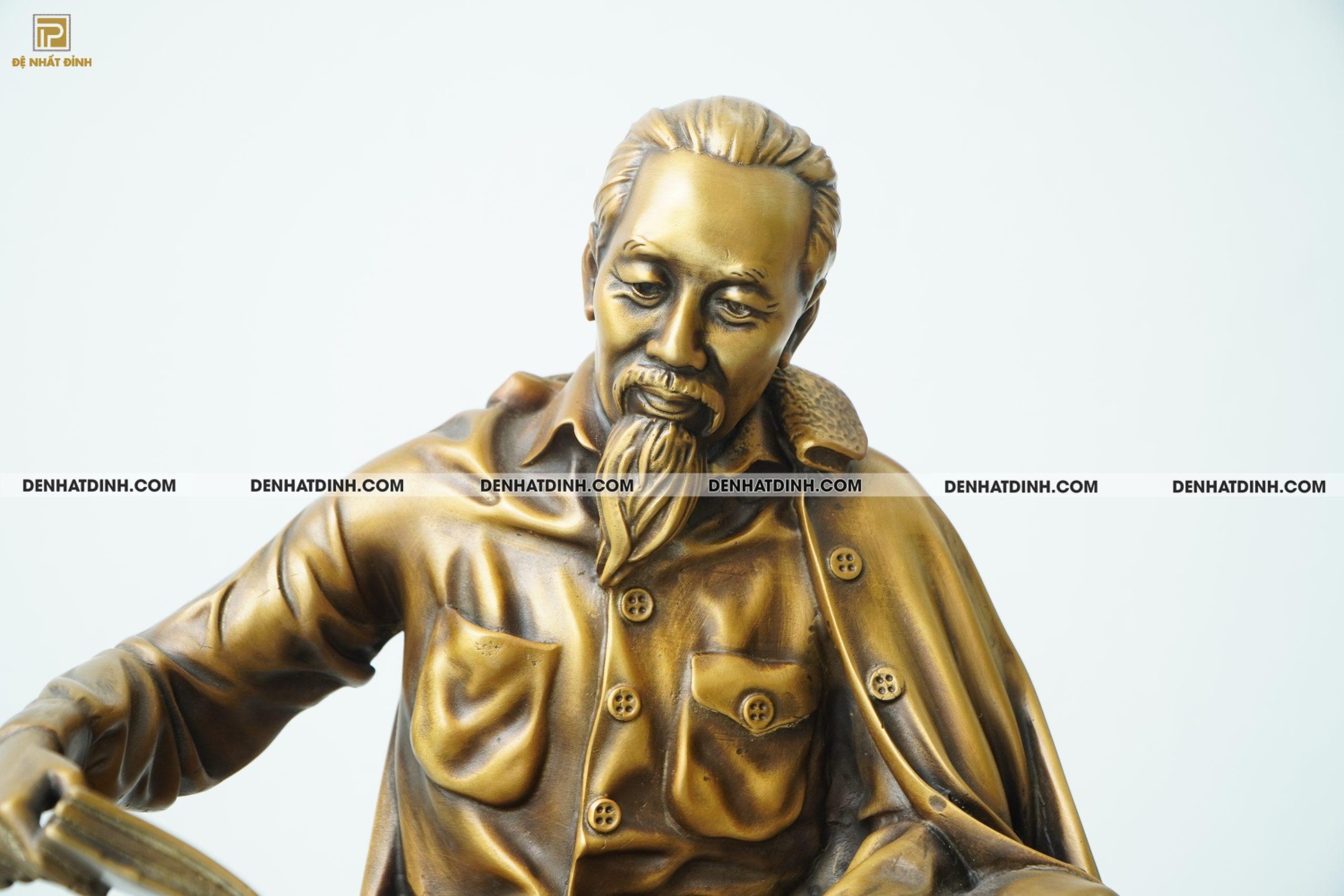 Đặc biệt, lớp màu hun giả cổ được xử lý tinh tế đã phủ lên tác phẩm một sắc thái trầm mặc, cổ kính, tăng chiều sâu lịch sử và làm nổi bật từng nếp áo, đường nét khuôn mặt và dáng ngồi của Bác. Lớp màu này không phai, không bong tróc, bền màu theo năm tháng, xứng đáng là món đồ trưng bày có giá trị truyền đời.