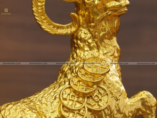 Tác phẩm Tượng Dê lông xù đeo đồng tiền dát vàng 24K là vật phẩm phong thủy được xưởng Đệ Nhất Đỉnh chế tác hoàn toàn thủ công, mang hình tượng con dê hiên ngang đứng trên tiền vàng, biểu trưng cho tài lộc, sự nghiệp hanh thông và gia đạo thịnh vượng.