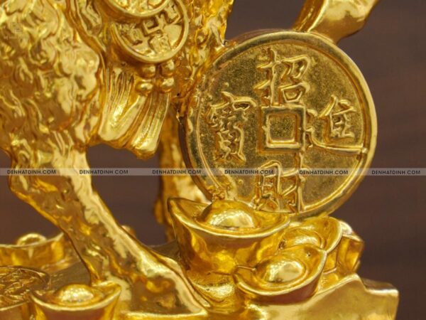 Từng chi tiết của bức tượng được thể hiện sống động: bộ lông xù tự nhiên, ánh vàng rực rỡ, trên lưng đeo những đồng tiền cổ nối liền như chuỗi tài lộc, phía dưới là nén vàng và tiền xu, tất cả cùng tạo nên một tổng thể hài hòa, tượng trưng cho may mắn và phú quý tràn đầy.