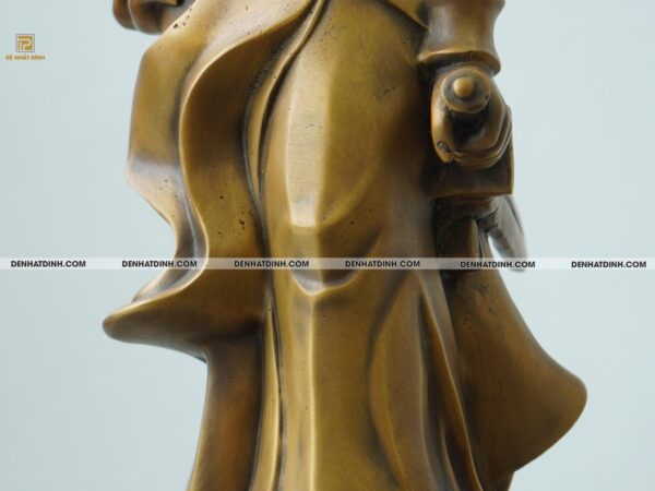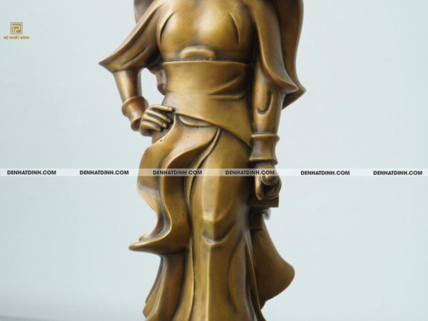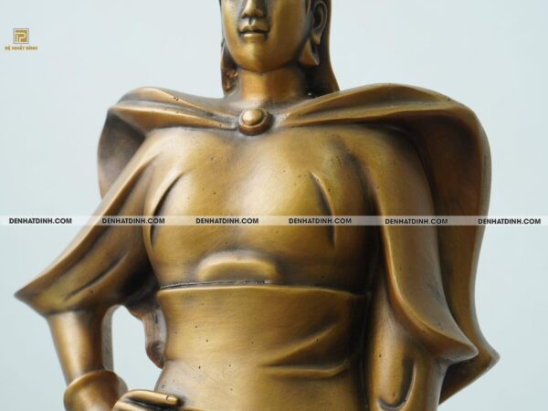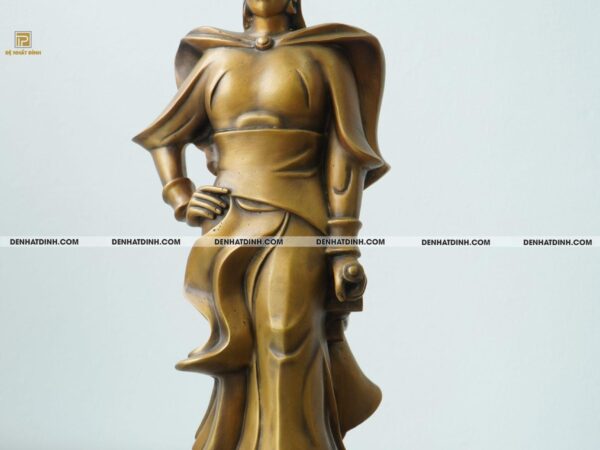 Từng đường gân, nếp áo, dáng đứng và ánh nhìn của tượng đều được đúc thủ công tỉ mỉ bởi các nghệ nhân lành nghề tại xưởng đồng Đệ Nhất Đỉnh – nơi lưu giữ tinh hoa nghề đúc truyền thống Việt Nam. Dáng đứng uy nghi, bàn tay nắm hờ bên hông, vạt áo tung bay theo thế gió… tất cả tạo nên một tổng thể hài hòa giữa mỹ thuật hiện đại và văn hóa lịch sử.
