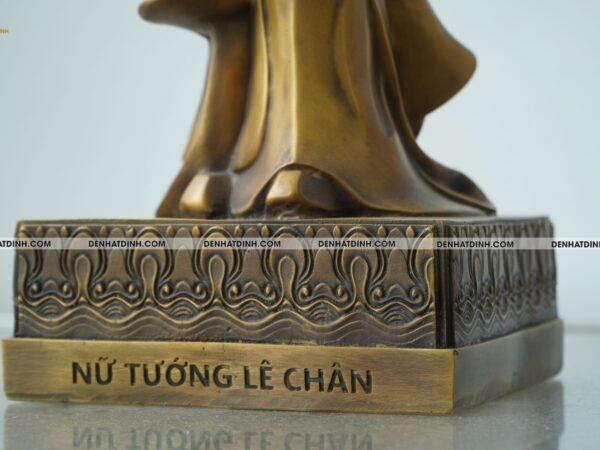 Phần chân đế tượng được chạm khắc hoa văn cổ điển, vững chãi và tinh tế, tạo thế nâng đỡ vững vàng cho toàn bộ thân tượng. Nổi bật là dòng chữ “NỮ TƯỚNG LÊ CHÂN” được khắc chìm – trang trọng, uy nghiêm – như lời khẳng định bất diệt về một tượng đài lịch sử.