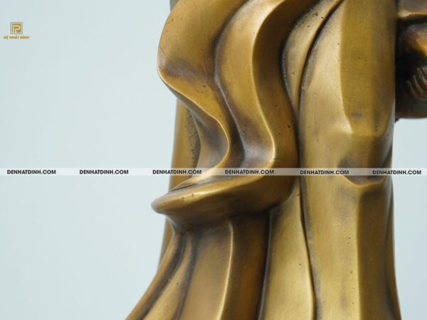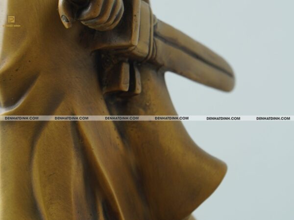 Sản phẩm được chế tác hoàn toàn bằng đồng catut cao cấp – dòng đồng thau đỏ có độ bền vượt trội, lên màu ánh vàng óng sang trọng. Lớp màu giả cổ phủ bên ngoài không chỉ tạo chiều sâu mỹ thuật mà còn tôn lên vẻ trầm mặc, cổ kính và linh thiêng – đúng với tinh thần và tôn vinh lịch sử.