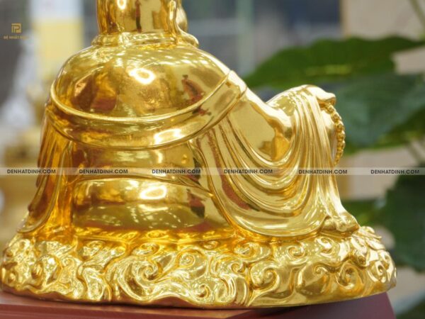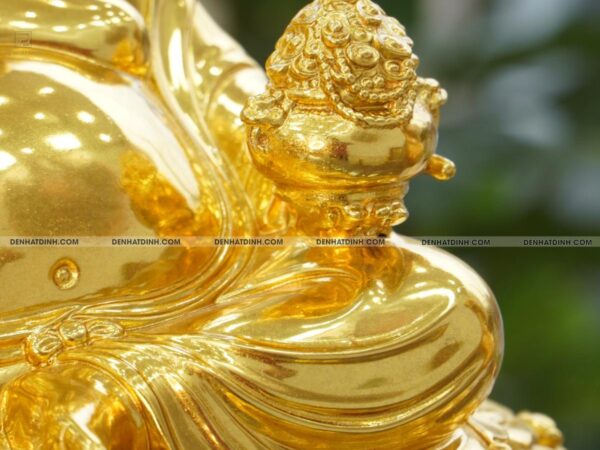 Lớp vàng lá dát thủ công bên ngoài tượng không chỉ giúp bề mặt sáng bóng, nổi bật mà còn mang ý nghĩa thu hút vượng khí, giúp tượng phát huy tối đa công năng phong thủy. Màu vàng còn tượng trưng cho sự giàu sang, thịnh vượng và quyền lực.