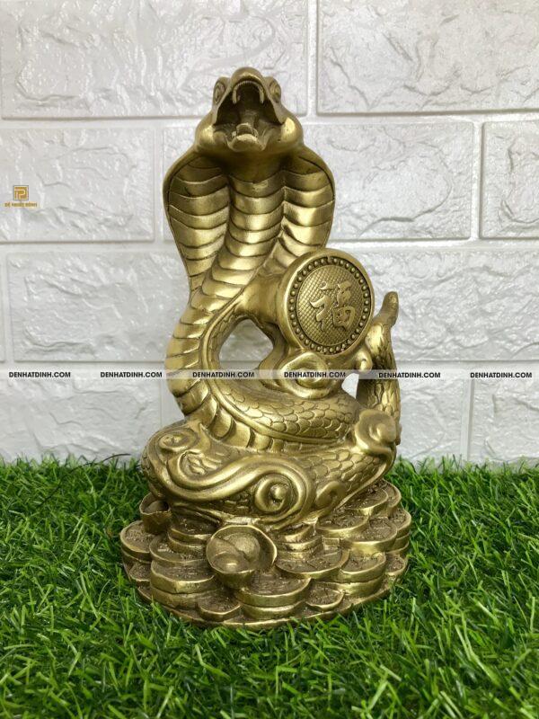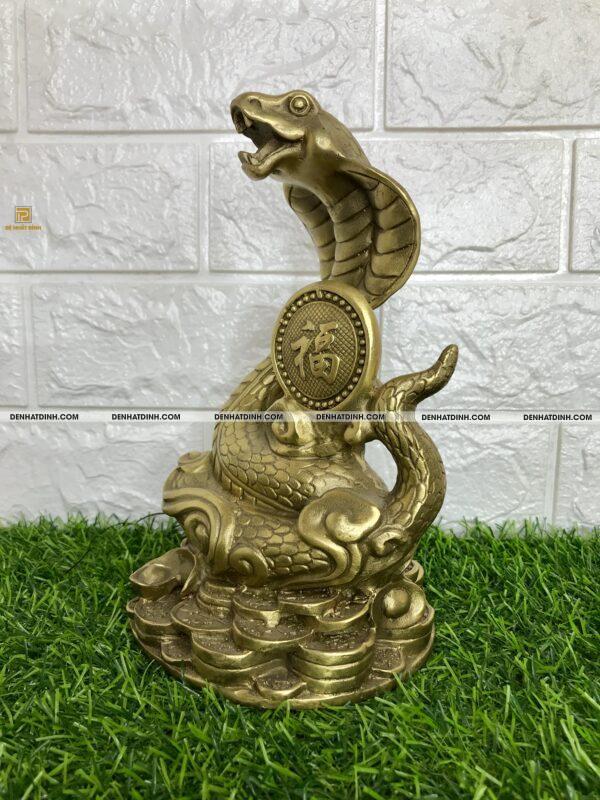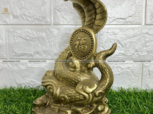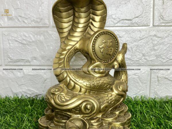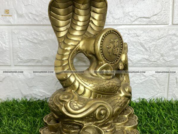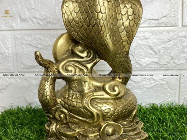 Trên thân rắn, từng vảy được chạm tỉ mỉ, lớp đồng vàng sáng bóng tạo nên hiệu ứng quyền quý, linh thiêng – vừa là vật phẩm trưng bày đẹp mắt, vừa mang năng lượng phong thủy mạnh mẽ.