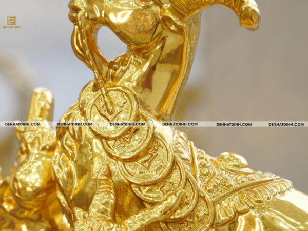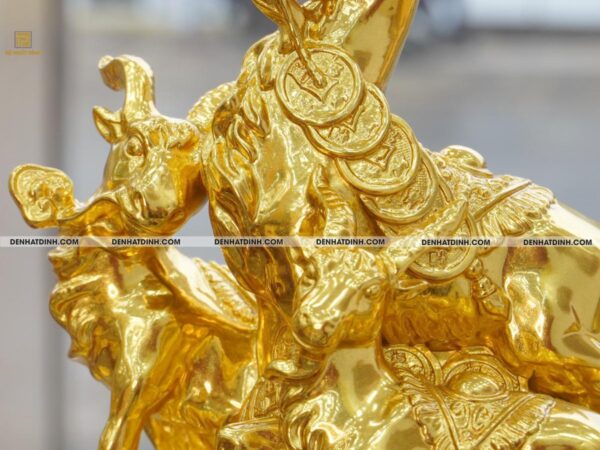 Dát vàng thủ công tinh xảo: Toàn bộ bề mặt tượng được dát vàng 9999 nguyên chất, mang đến vẻ đẹp rực rỡ, sang trọng, trường tồn với thời gian.