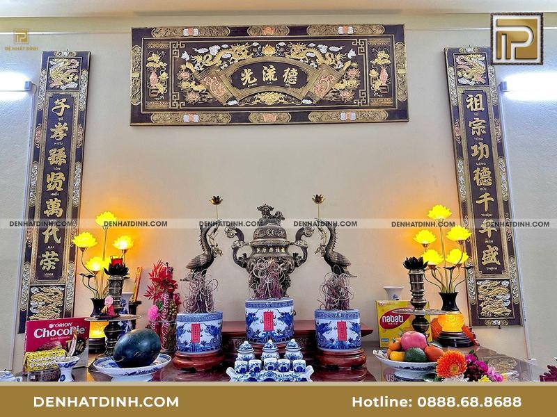 Hai bên đỉnh nên bày chân nến đồng đối xứng để tạo sự hài hòa. Phía sau có thể đặt thêm hoành phi câu đối cho không gian thêm trang trọng.