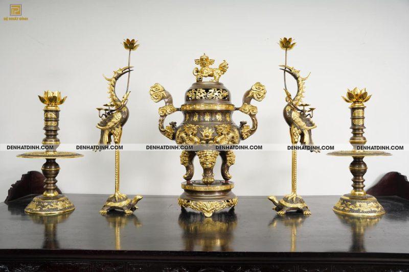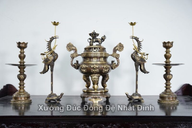 01 Đỉnh đồng (Lư hương): Thân đỉnh thường đúc nổi hình song long chầu nguyệt hoặc hoa sòi, nắp đỉnh có hình tượng con Nghê uy nghiêm.